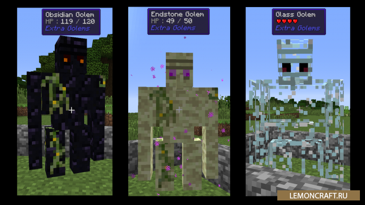 Мод Extra Golems добавляет в игру новые големы, которых вы сможете создавать из различных блоков. В зависимости из каких блоков созданы големы, их характеристики будут отличаться. Теперь у вас появится возможность создать защитника, который сможет отстоять ваши территории от всякой нечисти.